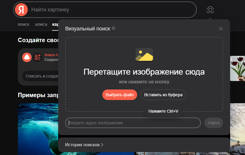 Abra yandex.ru/images. Na barra de busca, clique no botão com o ícone da câmera. Escolha uma das três opções: