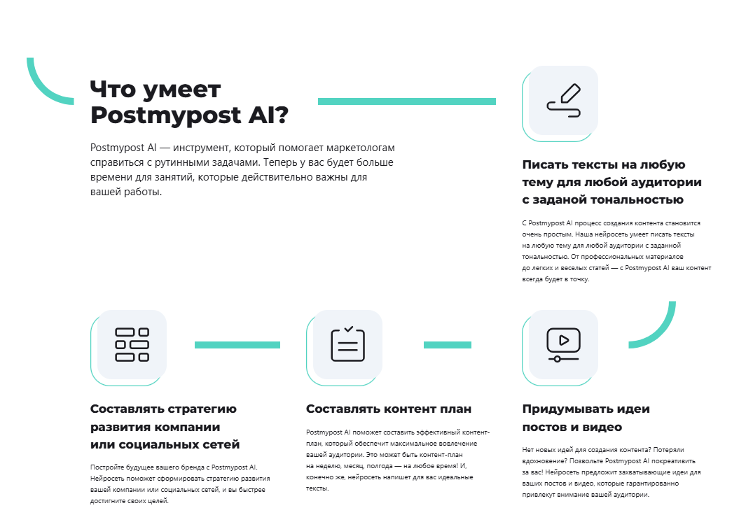 In the Postmypost personal account, there is a convenient block "AI Assistant" with ready-made tabs/buttons. Many functions work through simple forms – without writing complex requests. For example, in the "Write Text" tab, you see: