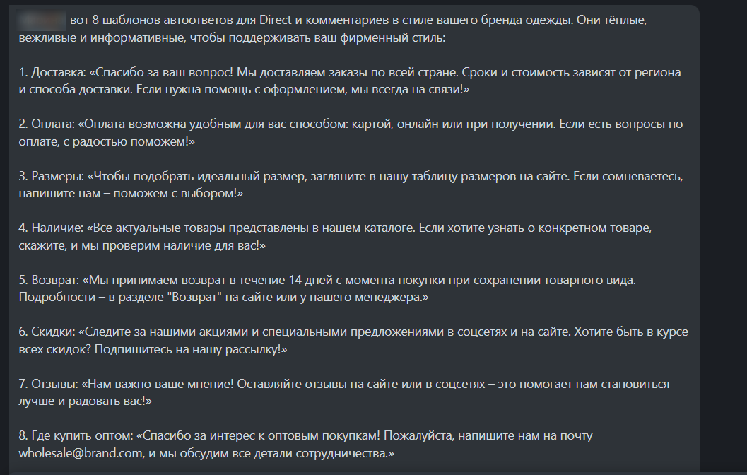 Auto-responses to common questions. "Create 8 templates for auto-responses for Direct/comments in the brand's style [description of tone]. Questions: delivery, payment, sizes, availability, returns, discounts, reviews, 'where to buy wholesale.'"