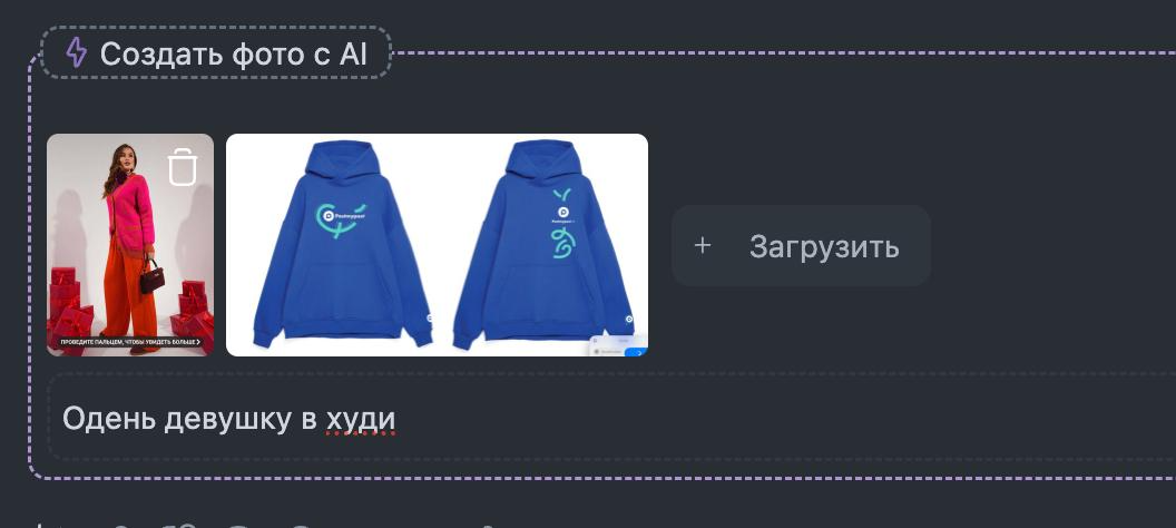 Generating a cover based on reference. "Generate an image for a post in the style of [upload reference 1: photo of a model + reference 2: brand color palette]. Theme: [description of the scene]. Format 1080×1080, style – minimalism 2026, light background, focus on the product [name]. Add text: '[headline]' in a modern font."