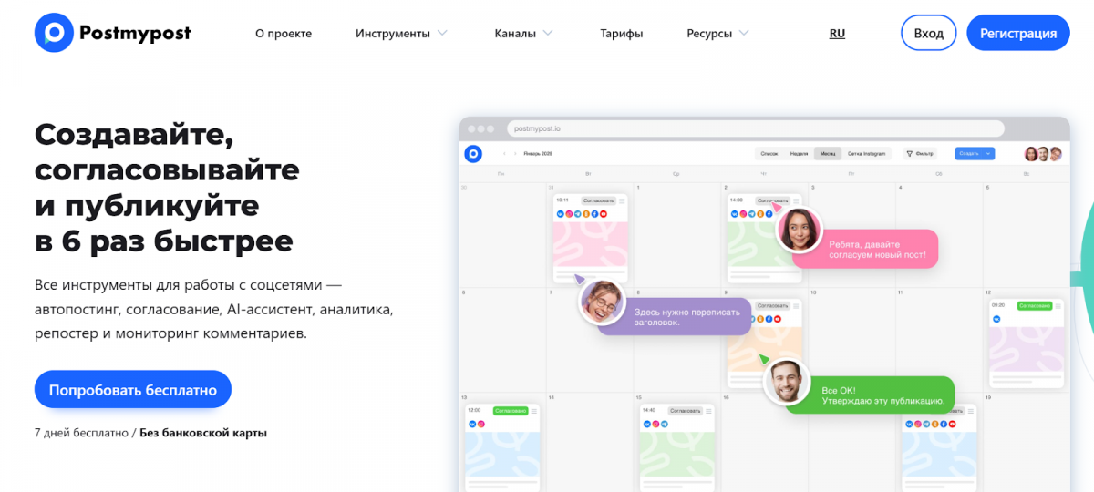 If you are tired of Google Sheets, where everything gets lost, or of manually posting across multiple accounts, use Postmypost. This Russian auto-posting and planning service is perfect for bloggers, SMM specialists, and small businesses. What’s especially great in 2026: