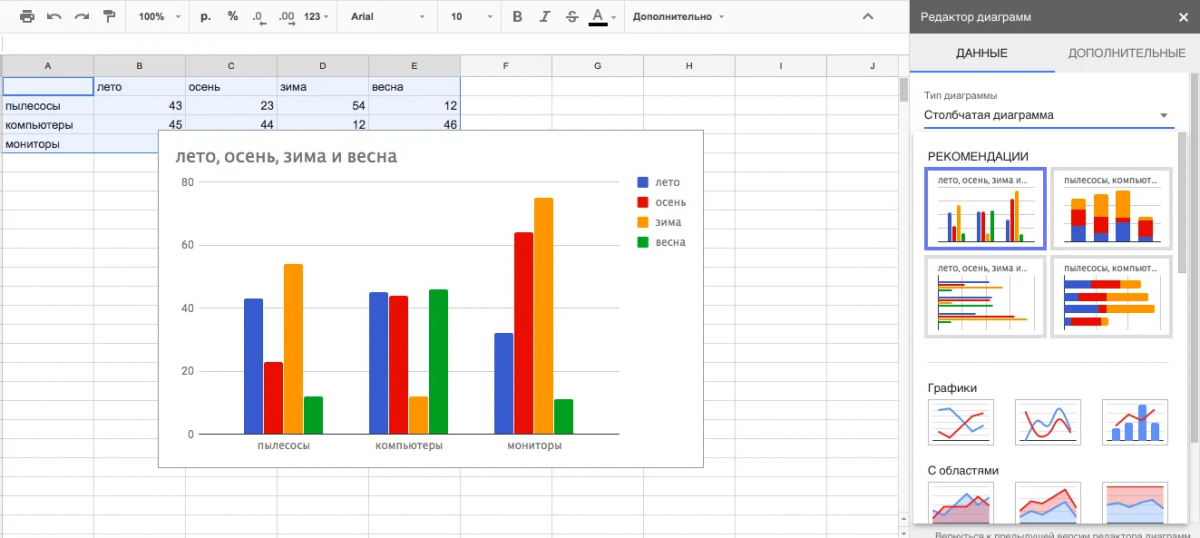 Charts visualize information. In "Insert" > "Chart," choose a type — bar or pie chart. Gemini can create them automatically upon request. Pivot tables (in "Data" > "Pivot Table") group data, showing totals by categories.