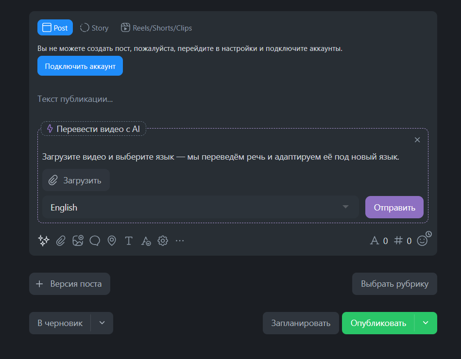 You upload a video once, and AI helps generate/edit texts, translate descriptions/hashtags/calls to action, adapt content to the required languages, and schedule publications for all accounts/countries considering local prime time. As a result, you get a video translated from Russian into one of dozens of available languages, with excellent synchronization, the required intonation, and additionally – with subtitles, all in just a few minutes. But that’s not all. Let’s list the main advantages of Postmypost considering the latest updates.