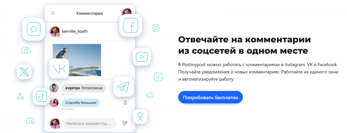 Postmypost allows you to respond to comments and messages even directly from Telegram notifications. This means you can close simple requests without opening a browser or application.