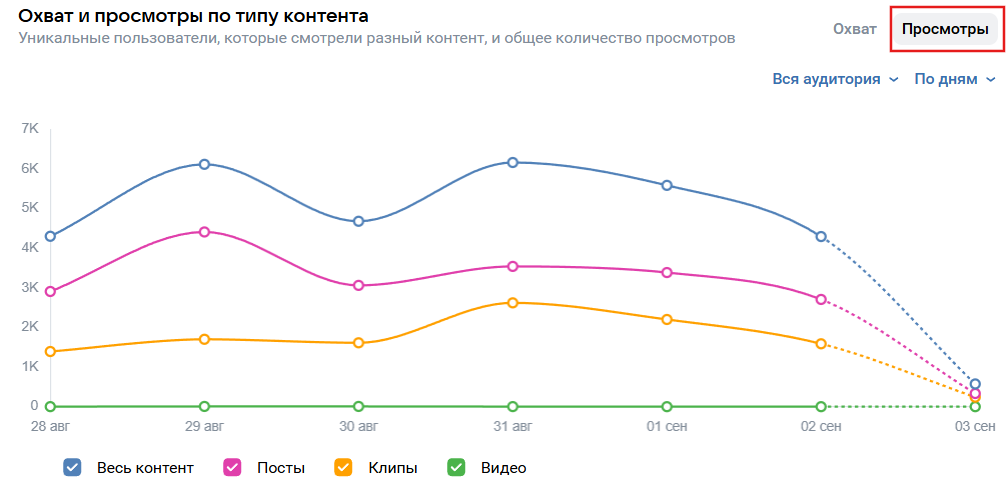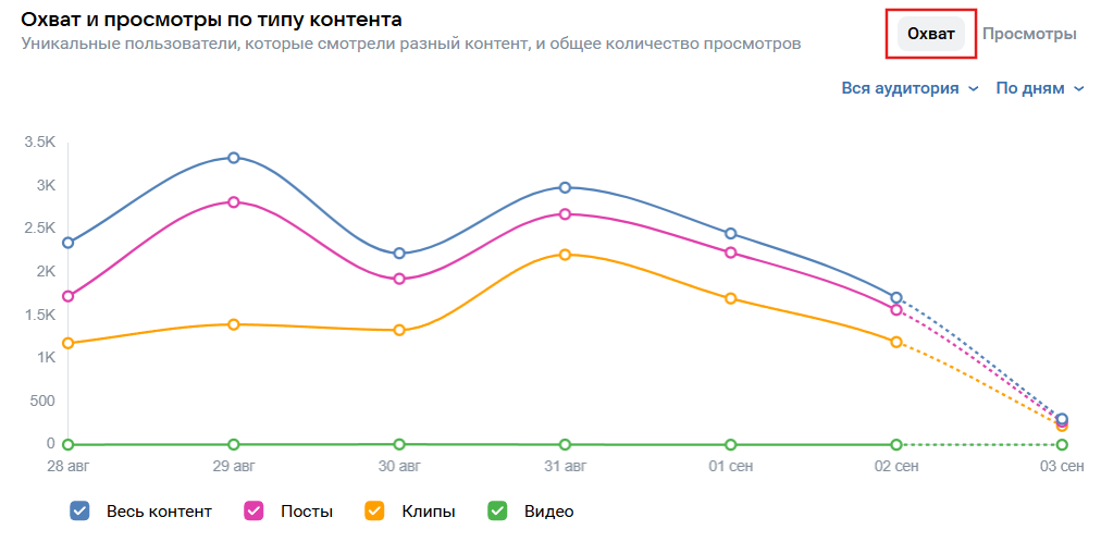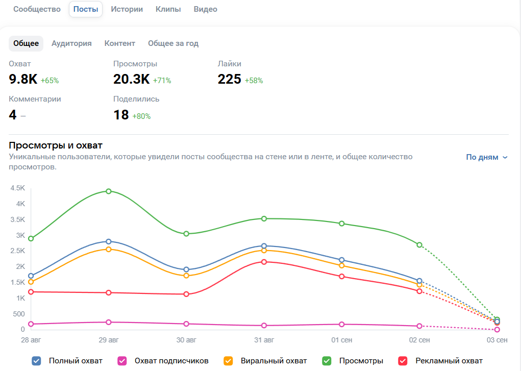 This section answers the main question: what exactly do people like. Here you can compare which type of posts gets more views and reactions — posts, photos, videos, clips, or products.