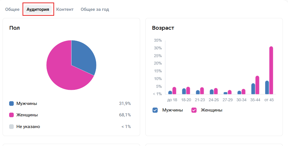 The "Audience" tab contains detailed demographics. This data helps understand if the actual audience matches the expected one. For example, if you sell cosmetics, but the statistics show a skew towards men aged 35+, something is amiss: either the advertising is misconfigured, or the content itself attracts a different type of audience.