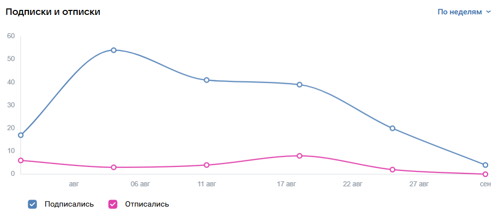 This is the most important block, located in the "General" section of "Community." The graphs show the dynamics of subscriptions, unsubscriptions, and net gains. Here it’s useful to look not only at the numbers but also at what they are related to. A sharp increase? Most likely, there was advertising or a viral post. A spike in unsubscriptions? Perhaps too many sales pitches or an unsuccessful mailing.