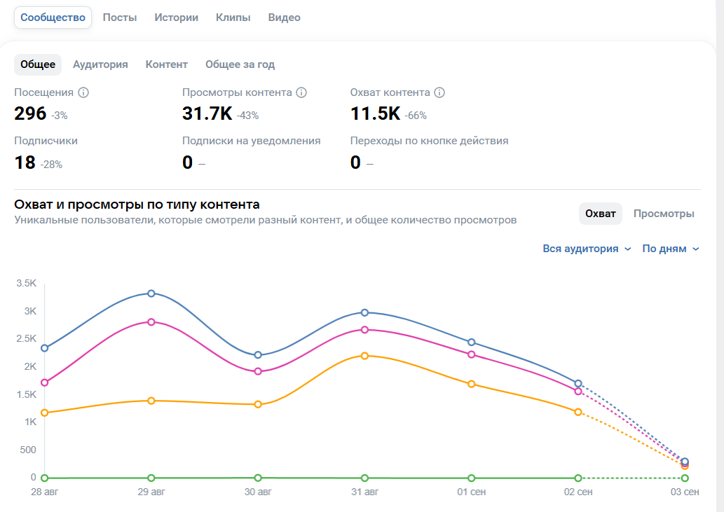 In the "Community" section, you can see reach, views, likes, comments, subscriptions and unsubscriptions, shares, clicks on the action button, and even subscriptions to notifications. Everything is conveniently presented in graphs.