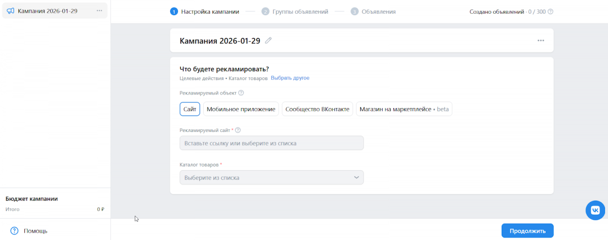 Выберите, что рекламируете ВКонтакте – сайт/каталог товаров/мобильное приложение и пр.