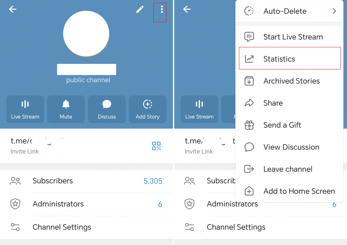 Данные можно посмотреть в приложении Telegram. Перейдите в свой канал и нажмите на строку с названием. Кликните на три точки и выберите нужную иконку.