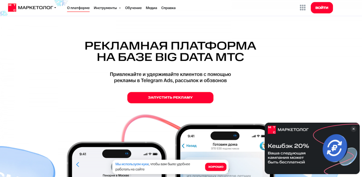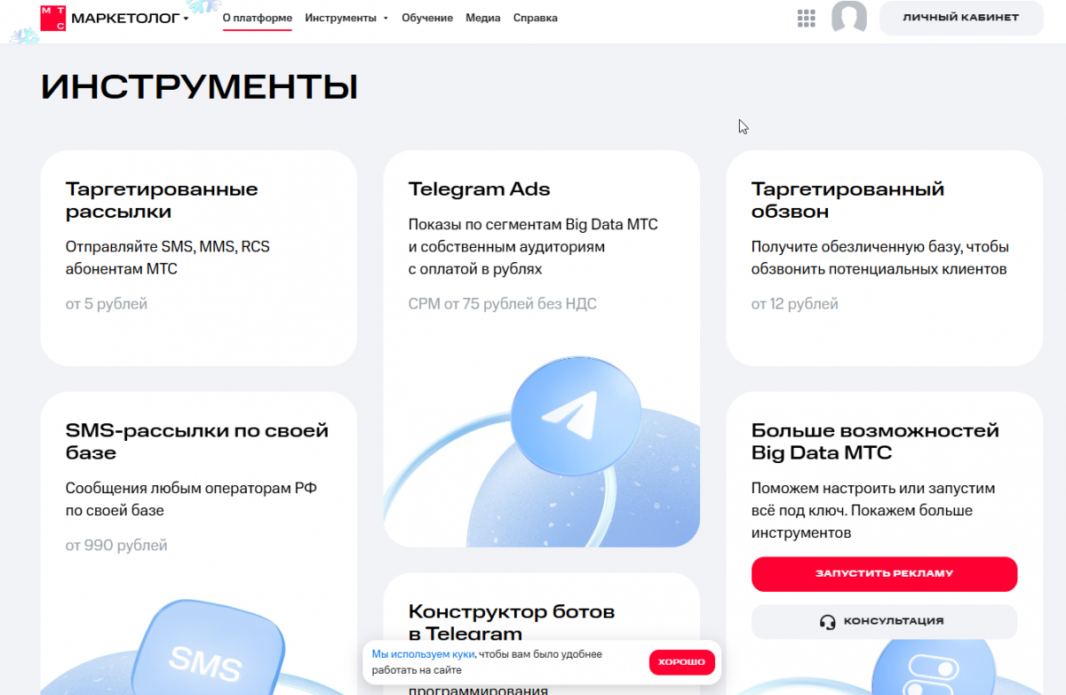 Платформа объединяет несколько каналов в один личный кабинет marketolog. Здесь доступна разная таргетированноя реклама: