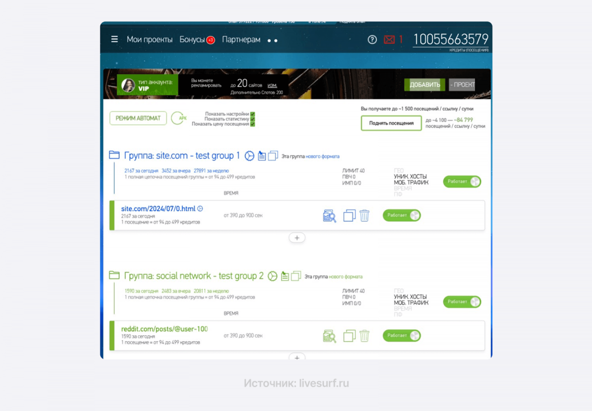LIVEsurf — это сервис, который помогает раскручивать страницы в соцсетях, маркетплейсы, сайты и даже видео за счет обмена трафиком между реальными пользователями. Каждый участник системы запускает специальное ПО, а его устройство начинает открывать сайты других участников. В то же время, владелец ресурса получает посещения на свой сайт.