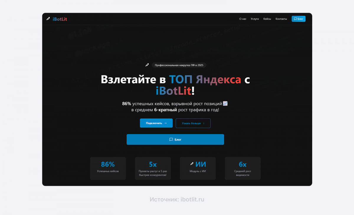 10. iBotLit. Сервис с ИИ-модулями, который можно использовать для накрутки поведенческих факторов в Яндексе. С гибкой настройкой и стратегиями продвижения.