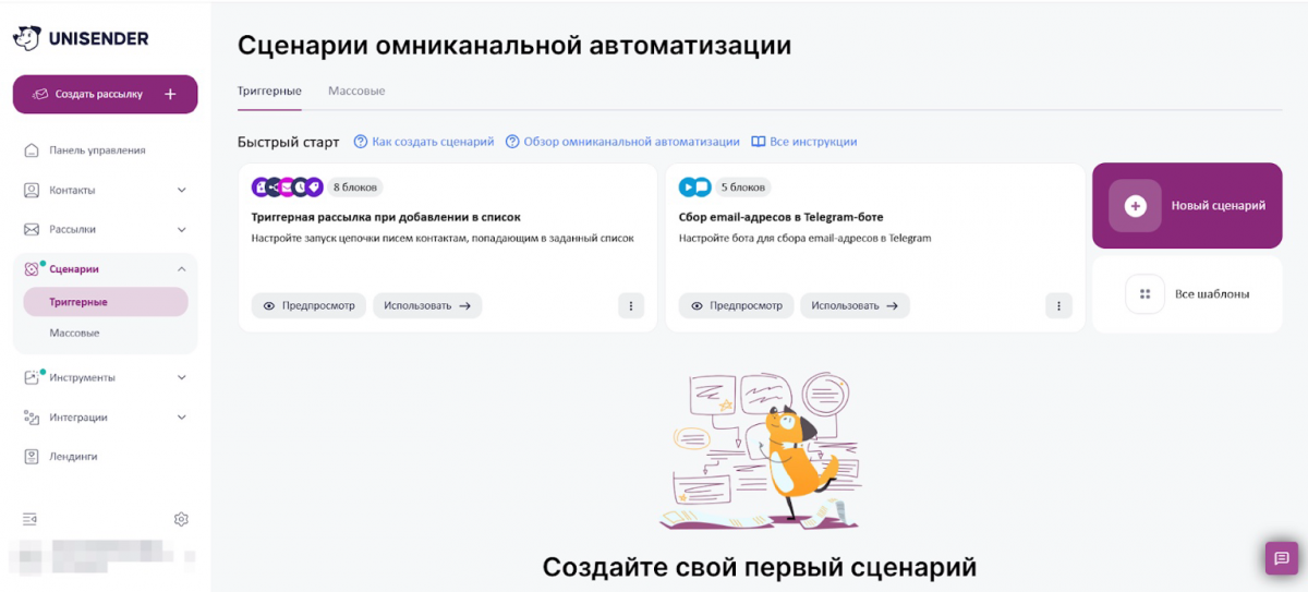 Для более продвинутых задач email-маркетинга в Unisender реализованы сценарии омниканальной автоматизации. Платформа позволяет объединять email-рассылки с чат-ботами и другими каналами, выстраивать цепочки сообщений и запускать автоматические действия без ручного участия. Например, сервис может сам отправлять письма новым подписчикам, сегментировать аудиторию, обновлять списки и реагировать на действия клиентов в реальном времени.